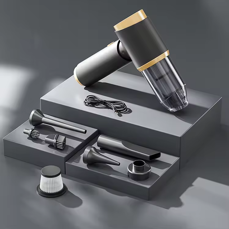 Multifunctional portable car vacuum cleaner with powerful suction, rechargeable for home use, and wireless brushless motor.